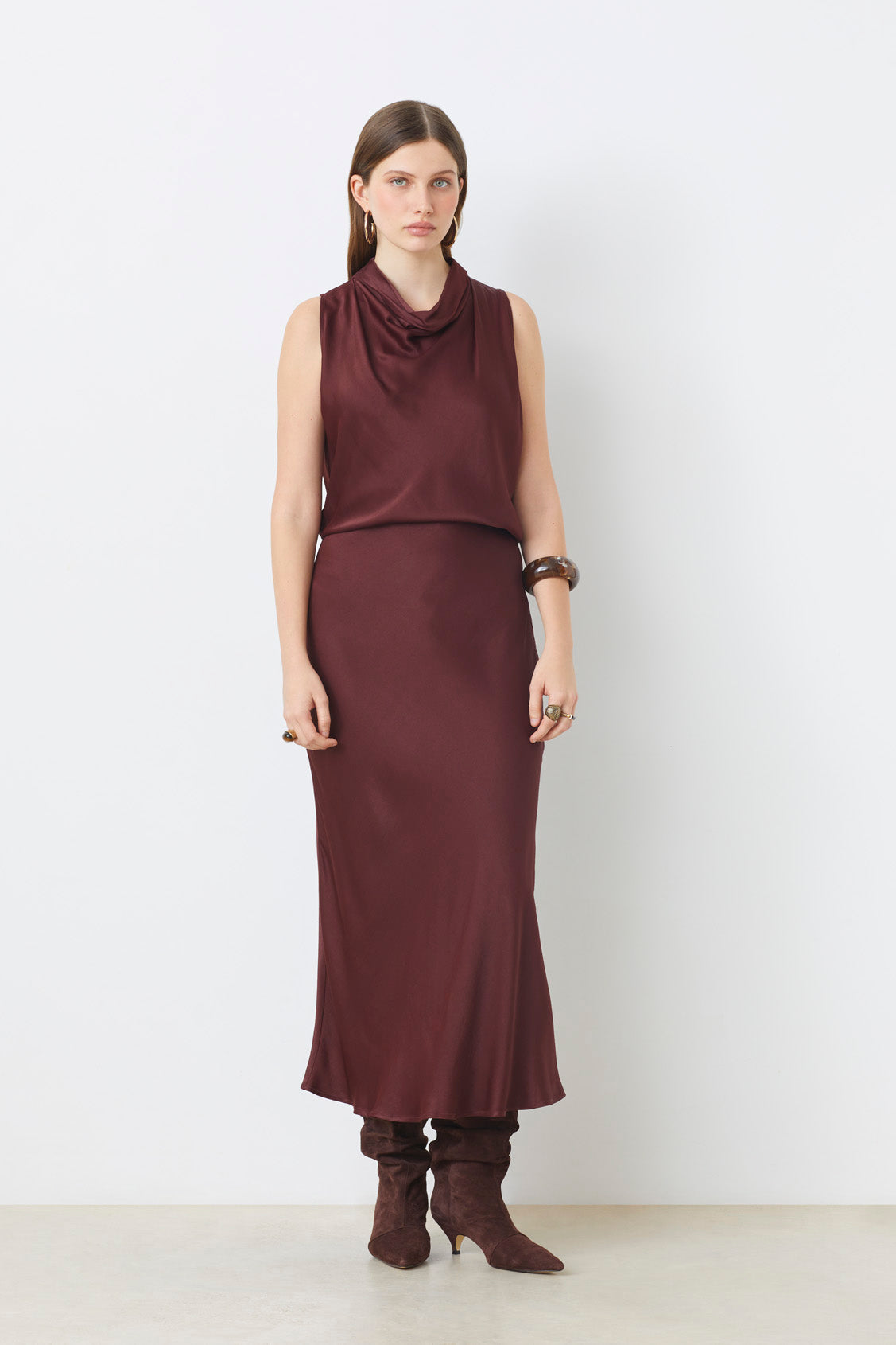 Make a bold statement with this long skirt in a rich prune shade. Its flowing silhouette moves with confidence, perfect for those who dare to stand out. The deep color adds a touch of mystery and elegance, elevating any outfit from simple to striking. Ideal for making an unforgettable impression.