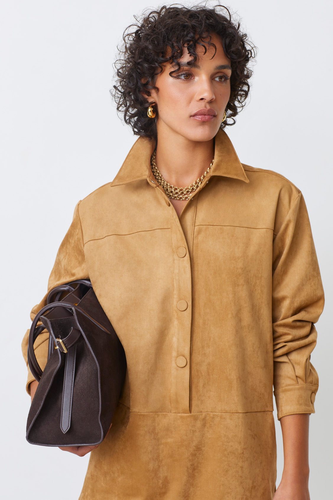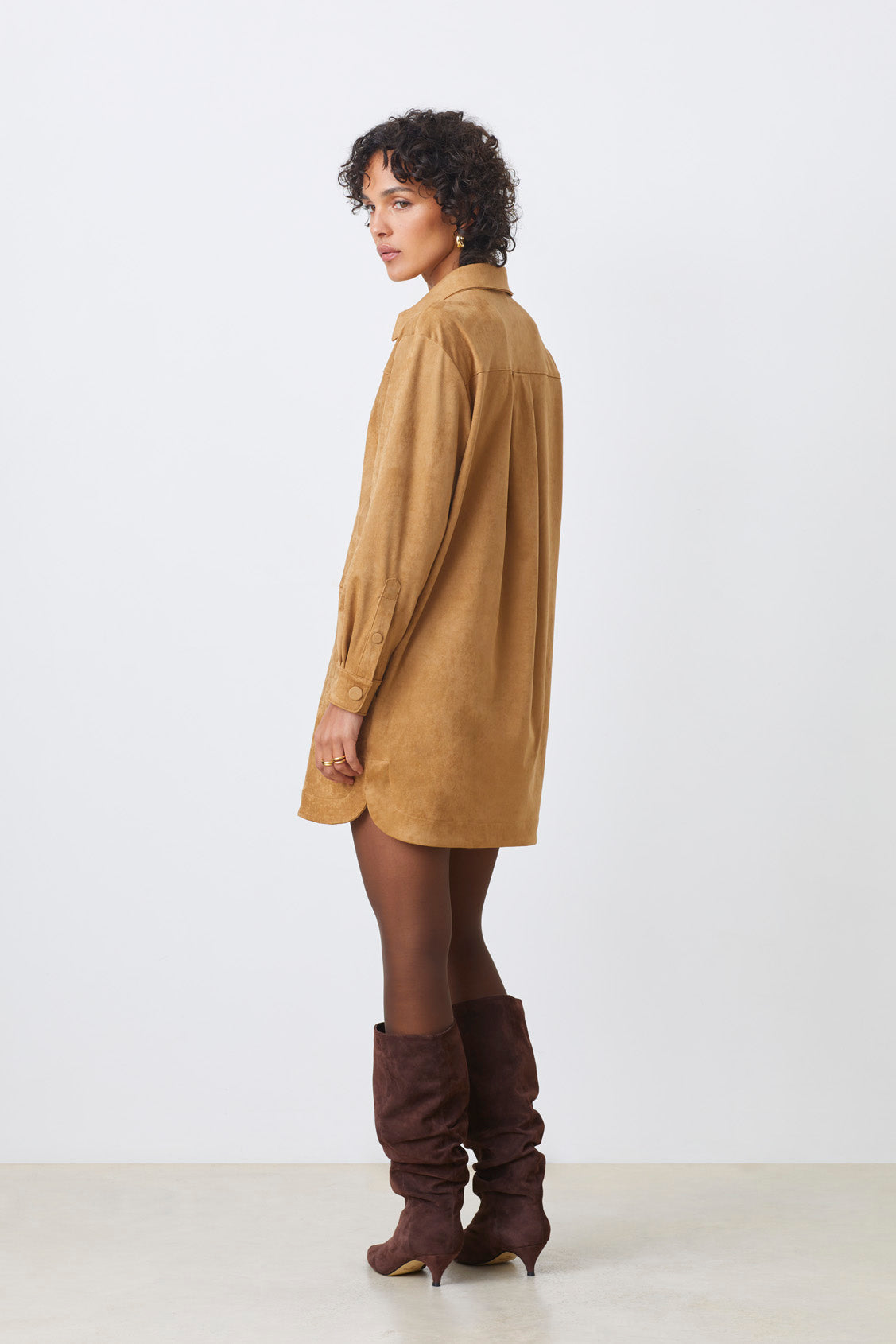 Turn heads with this tan suede-like short dress that blends bold style and effortless charm. Its sleek silhouette hugs your figure, while the rich tan shade adds a warm, adventurous touch. Perfect for nights out or daring daytime looks, this dress empowers you to own every moment with confidence and edge.
